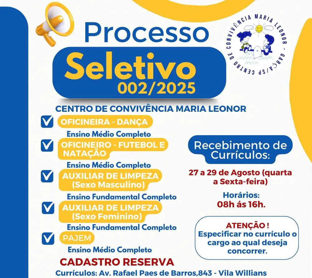Centro de Convivência Maria Leonor abre processo seletivo para cadastro reserva em diversos cargos; currículos podem ser entregues de 27 a 29 de agosto.