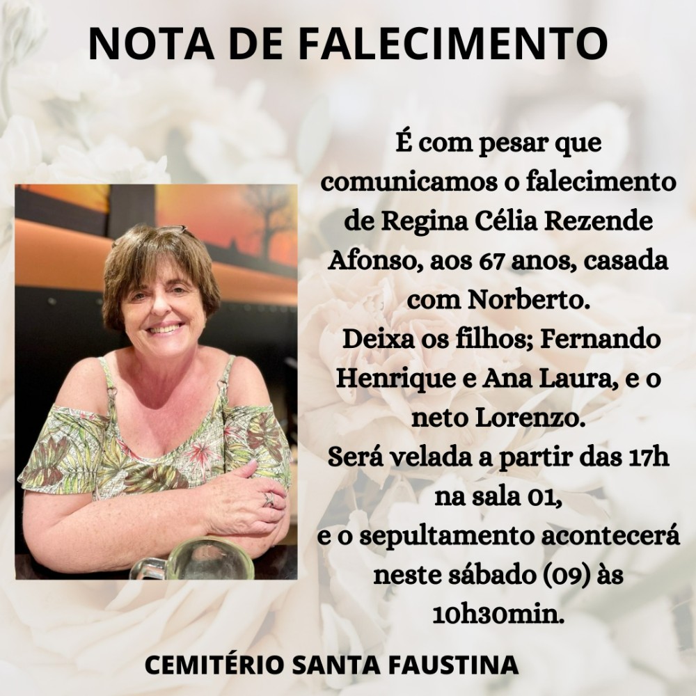 Nota de Falecimento: Regina Célia Rezende Afonso, 67 anos