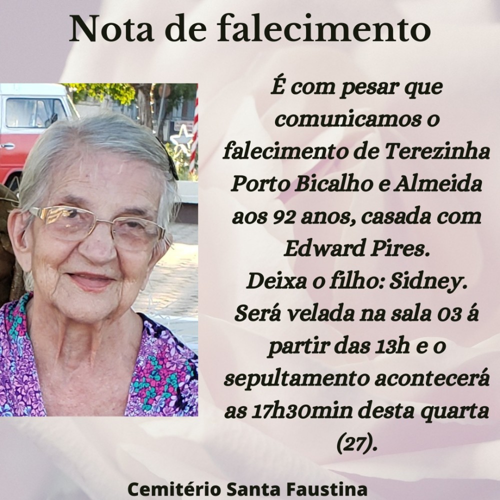 Nota de Falecimento: Terezinha Porto Bicalho de Almeida, 92 anos