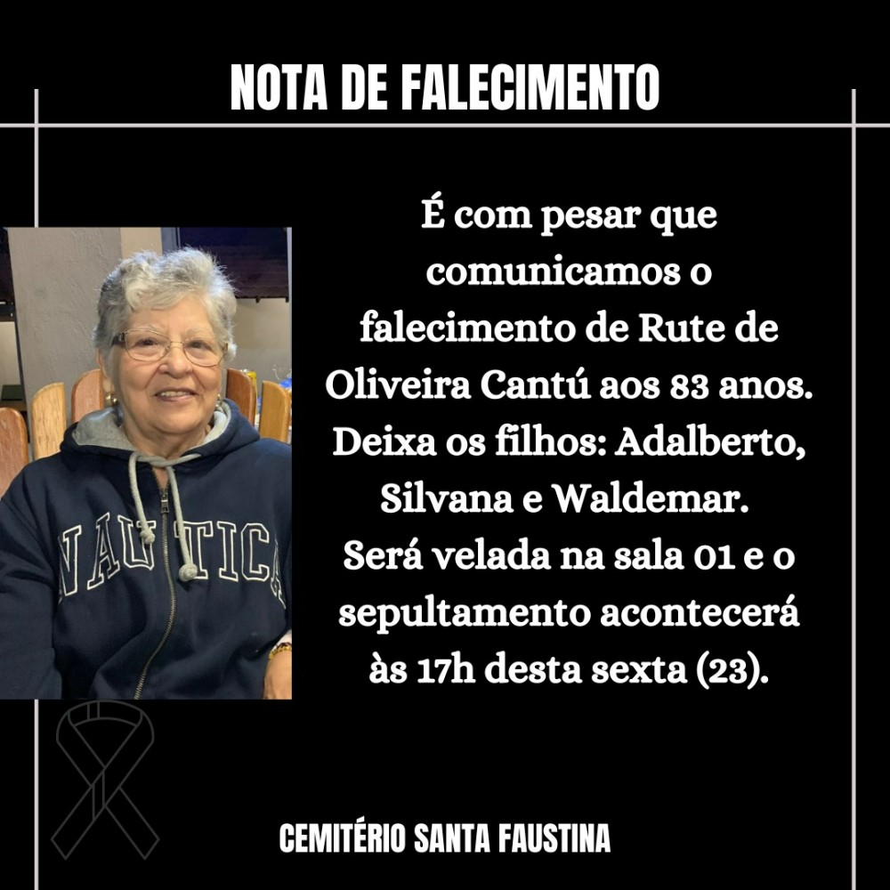 Nota de Falecimento: Rute de Oliveira Cantú, 83 anos