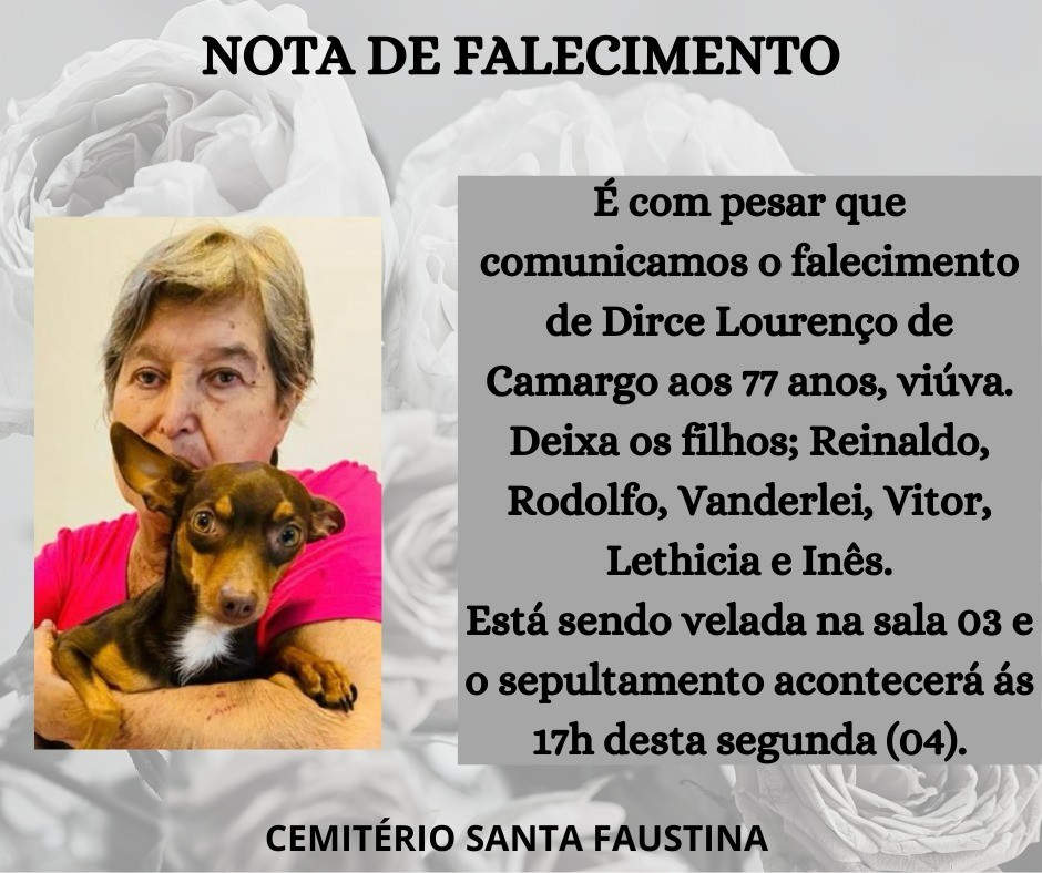 Nota de Falecimento: Dirce Lourenço de Camargo, 77 anos
